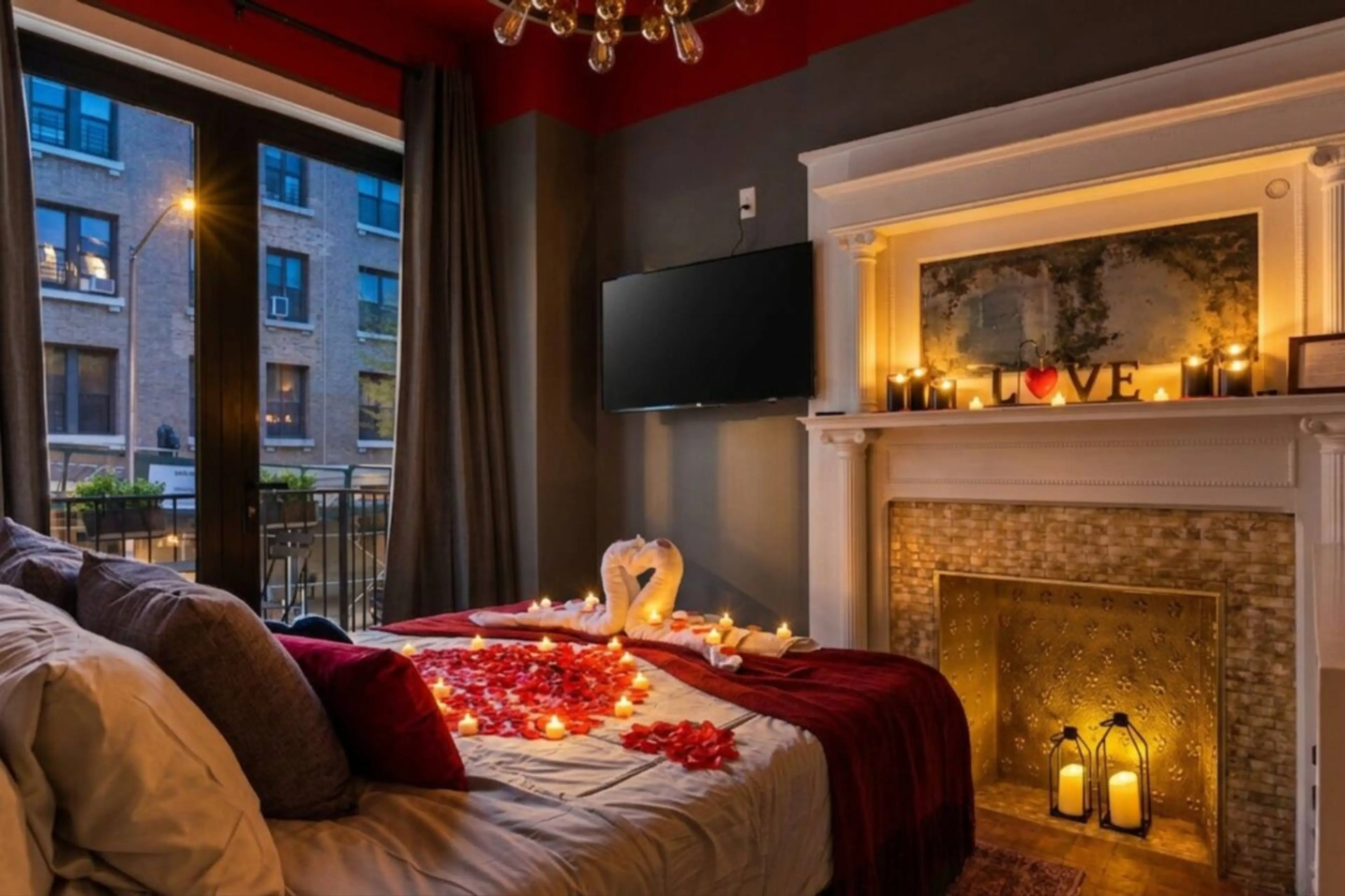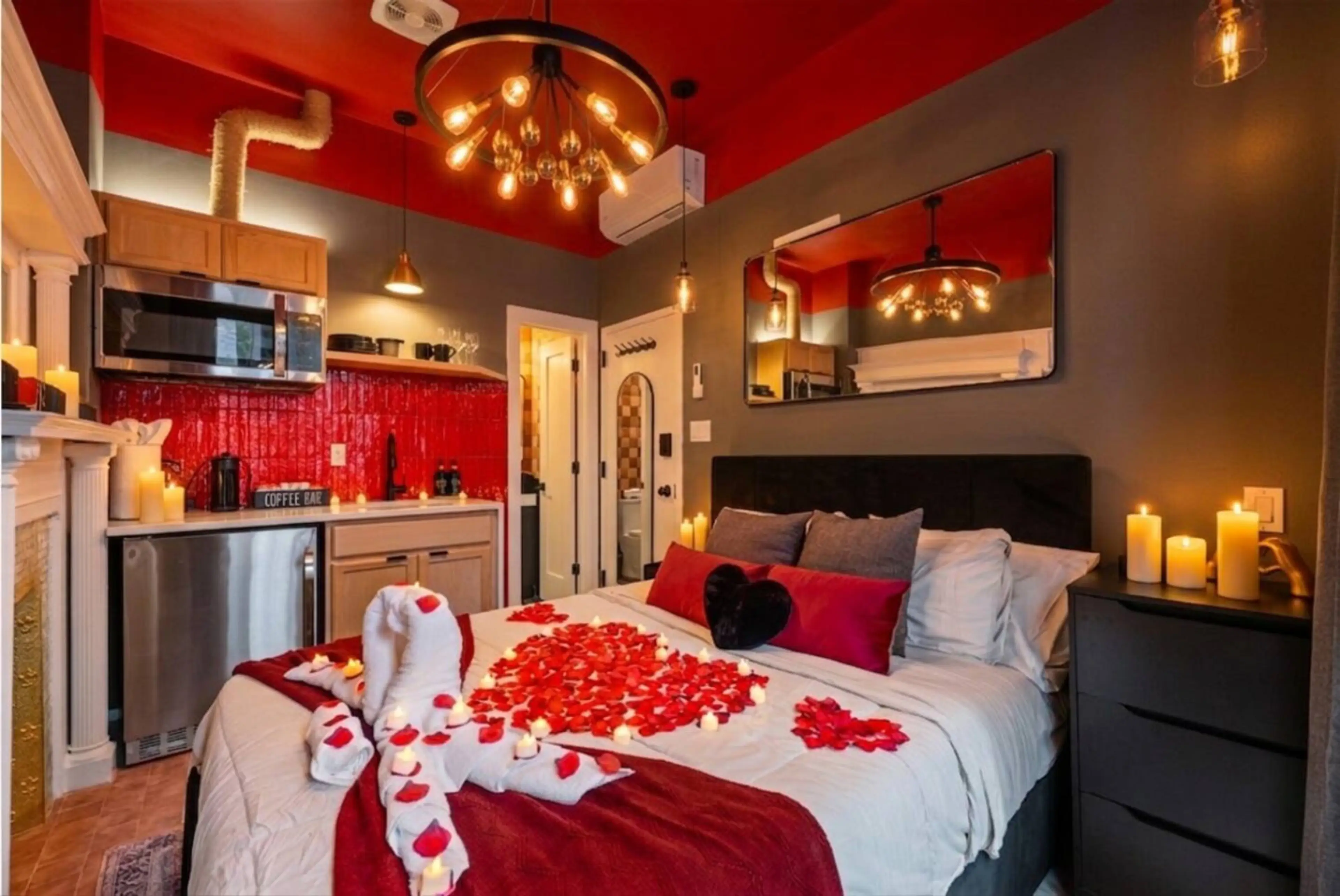 Welcome to your intimate Manhattan hideaway. Bold, electric, and romantic — this micro-suite matches the city's energy perfectly. A queen bed dressed in black, red, and gold, a private balcony for two, and a boutique design that feels more curated hotel than typical rental. A kitchenette and private...